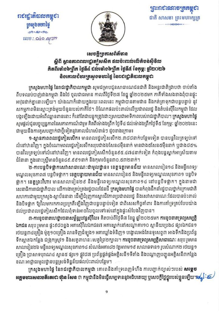 (ភ្នំពេញ)៖ ក្រសួងមហាផ្ទៃ នៅព្រឹកថ្ងៃទី៥ ខែកុម្ភៈ ឆ្នាំ២០២៦នេះ បានឲ្យដឹងថា គិតចាប់ពីម៉ោង៦ព្រឹក ថ្ងៃទី៤ ខែមករា ដល់ម៉ោង៦ព្រឹក ថ្ងៃទី៥ ខែកុម្ភៈ ឆ្នាំ២០២៦នេះ មានពលរដ្ឋភៀសសឹក២,៣៨៨នាក់បន្ថែមទៀត បានបន្តវិលត្រឡប់ទៅលំនៅឋានវិញ ដូច្នេះក្នុងចំណោមពលរដ្ឋភៀសសឹកសរុបជាង៦សែន៤ម៉ឺននាក់ មានប្រមាណ៥សែន៥ម៉ឺននាក់ បានវិលត្រឡប់ទៅលំនៅឋានវិញ។ ពលរដ្ឋភៀសសឹកបន្តស្នាក់នៅជំរំមានចំនួន៩៥,៤៧៤នាក់ ក្នុងនោះស្រ្តីមាន៤៩,៩៩១នាក់ និងកុមារ៣០,៥៣២នាក់។ ការភៀសសឹកទ្រង់ទ្រាយធំបែបនេះ បានធ្វើឲ្យប៉ះពាល់យ៉ាងធ្ងន់ធ្ងរ ទាំងផ្នែកមុខរបរ សុខុមាលភាព សាធារណៈ សិទ្ធិលំនៅឋាន ជាពិសេសសិទ្ធិទទួលបានការសិក្សារបស់កុមារ និងប៉ះទង្គិចផ្លូវចិត្តដ៏គួរឲ្យព្រួយបារម្ភ។ ជាងនេះទៅទៀត ពលរដ្ឋភៀសសឹកខ្លះ វិលដល់ភូមិករមែន ប៉ុន្តែត្រូវបង្ខំចិត្តស្នាក់នៅក្នុងជំរុំបណ្ដោះអាសន្នជាថ្មីទៀត ដោយសារផ្ទះសំបែងបានខូចខាតខ្ទេចរាបដល់ដី និងពោរពេញដោយសំណល់យុទ្ធភណ្ឌមិនទាន់ផ្ទុះរបស់យោធាថៃ។ ខាងក្រោមនេះ ជាសេចក្ដីប្រកាសព័ត៌មានរបស់ក្រសួងមហាផ្ទៃ៖