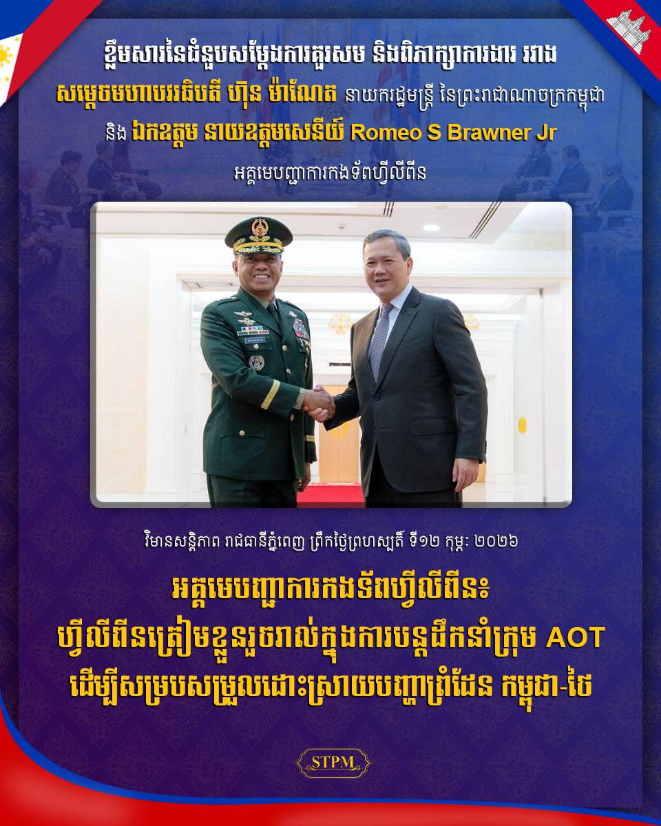 នាព្រឹកថ្ងៃទី១២ ខែកុម្ភៈ ឆ្នាំ២០២៦, សម្ដេចមហាបវរធិបតី ហ៊ុន ម៉ាណែត នាយករដ្ឋមន្ត្រី នៃព្រះរាជាណាចក្រកម្ពុជា បានអនុញ្ញាតឱ្យឯកឧត្តម នាយឧត្តមសេនីយ៍ Romeo S. Brawner Jr. អគ្គមេបញ្ជាការកងទ័ពហ្វីលីពីន ចូលជួបសម្ដែងការគួរសម និងពិភាក្សាការងារ នៅវិមានសន្ដិភាព។ ក្នុងឱកាសនៃជំនួបនេះ, ឯកឧត្តម នាយឧត្តមសេនីយ៍ អគ្គមេបញ្ជាការកងទ័ពហ្វីលីពីន បានថ្លែងអំណរគុណយ៉ាងជ្រាលជ្រៅជូនចំពោះ សម្ដេចធិបតី ដែលបានអនុញ្ញាតឱ្យរូបឯកឧត្តម និងគណៈប្រតិភូ ចូលជួបសម្ដែងការគួរសម និងពិភាក្សាការងារ។ ឯកឧត្តមអគ្គមេបញ្ជាការ ក៏បានរំលឹកឡើងវិញនូវទំនាក់ទំនង និងកិច្ចសហប្រតិបត្តិការដ៏ល្អ និងយូរអង្វែង រវាងប្រទេសទាំងពីរ ជាពិសេសរវាងកងទ័ព និងកងទ័ព។ ក្នុងន័យនេះ, ឯកឧត្តមបានគូសបញ្ជាក់អំពីការប្ដេជ្ញាចិត្តក្នុងការបន្តជំរុញទំនាក់ទំនង និងកិច្ចសហប្រតិបត្តិការកងទ័ព រវាងប្រទេសទាំងពីរឱ្យកាន់តែរីកចម្រើនបន្ថែមទៀត។ ជាការឆ្លើយតប, សម្ដេចធិបតី បានសម្ដែងនូវការស្វាគមន៍យ៉ាងកក់ក្ដៅចំពោះ ឯកឧត្តមអគ្គមេបញ្ជាការ និងគណៈប្រតិភូ ដែលបានអញ្ជើញមកបំពេញទស្សនកិច្ចនៅកម្ពុជា និងរីករាយដែលបានជួបជាមួយ ឯកឧត្តមអគ្គមេបញ្ជាការជាថ្មីម្តងទៀត។ សម្ដេចធិបតី ក៏បានសម្ដែងនូវការពេញចិត្ត និងវាយតម្លៃខ្ពស់ចំពោះវឌ្ឍនភាពនៃទំនាក់ទំនង និងកិច្ចសហប្រតិបត្តិការក្នុងវិស័យការពារជាតិ នៃប្រទេសទាំងពីរ ជាពិសេស កិច្ចសហប្រតិបត្តិការក្នុងការចែករំលែកបទពិសោធន៍ និងការកសាងសមត្ថភាពរវាងកងទ័ពនៃប្រទេសទាំងពីរ។ សម្ដេចធិបតី បានបង្ហាញនូវក្ដីសង្ឃឹមយ៉ាងមុតមាំថា កិច្ចសហប្រតិបត្តិការរវាងកងទ័ពទាំងពីរ នឹងត្រូវបានពង្រឹង និងពង្រីកបន្ថែមទៀត ទាំងផ្នែកកងទ័ពជើងគោក ជើងទឹក និងជើងអាកាស។ ពាក់ព័ន្ធនឹងសភាពការណ៍តាមបណ្ដោយព្រំដែនកម្ពុជា-ថៃ, សម្ដេចធិបតី ក៏បានបញ្ជាក់ជូនឯកឧត្តមអគ្គមេបញ្ជាការ និងគណៈប្រតិភូនូវការវិវត្តថ្មីៗ នៃសភាព ការណ៍ព្រំដែន កម្ពុជា-ថៃ និងបញ្ជាក់ពីជំហររបស់កម្ពុជាក្នុងការដោះស្រាយបញ្ហាព្រំដែនដោយសន្តិវិធី ផ្អែកលើកិច្ចព្រមព្រៀងទ្វេភាគី អនុសញ្ញា និងសន្ធិសញ្ញាដែលមានស្រាប់ ព្រមទាំងច្បាប់អន្តរជាតិ។ កម្ពុជាប្ដេជ្ញាចិត្តយ៉ាងមុតមាំក្នុងការគោរពនូវកិច្ចព្រមព្រៀងដែលប្រទេសទាំងពីរបានឯកភាពគ្នានាពេលកន្លងមក។ បន្ថែមលើនេះ, សម្ដេចធិបតី បានវាយតម្លៃខ្ពស់ចំពោះតួនាទីរបស់ក្រុមអ្នកសង្កេតការណ៍អាស៊ាន (AOT) និងជឿជាក់ថា ក្រោមការដឹកនាំរបស់ហ្វីលីពីន ក្រុម AOT នឹងបន្តចូលរួមចំណែកយ៉ាងសកម្មថែមទៀតក្នុងការសម្របសម្រួលដោះស្រាយបញ្ហាព្រំដែន កម្ពុជា-ថៃ ដោយសន្តិវិធី។ ឯកឧត្តមអគ្គមេបញ្ជាការ បានលើកឡើងថា ហ្វីលីពីនបានតាមដានយ៉ាងយកចិត្តទុកដាក់ចំពោះបញ
